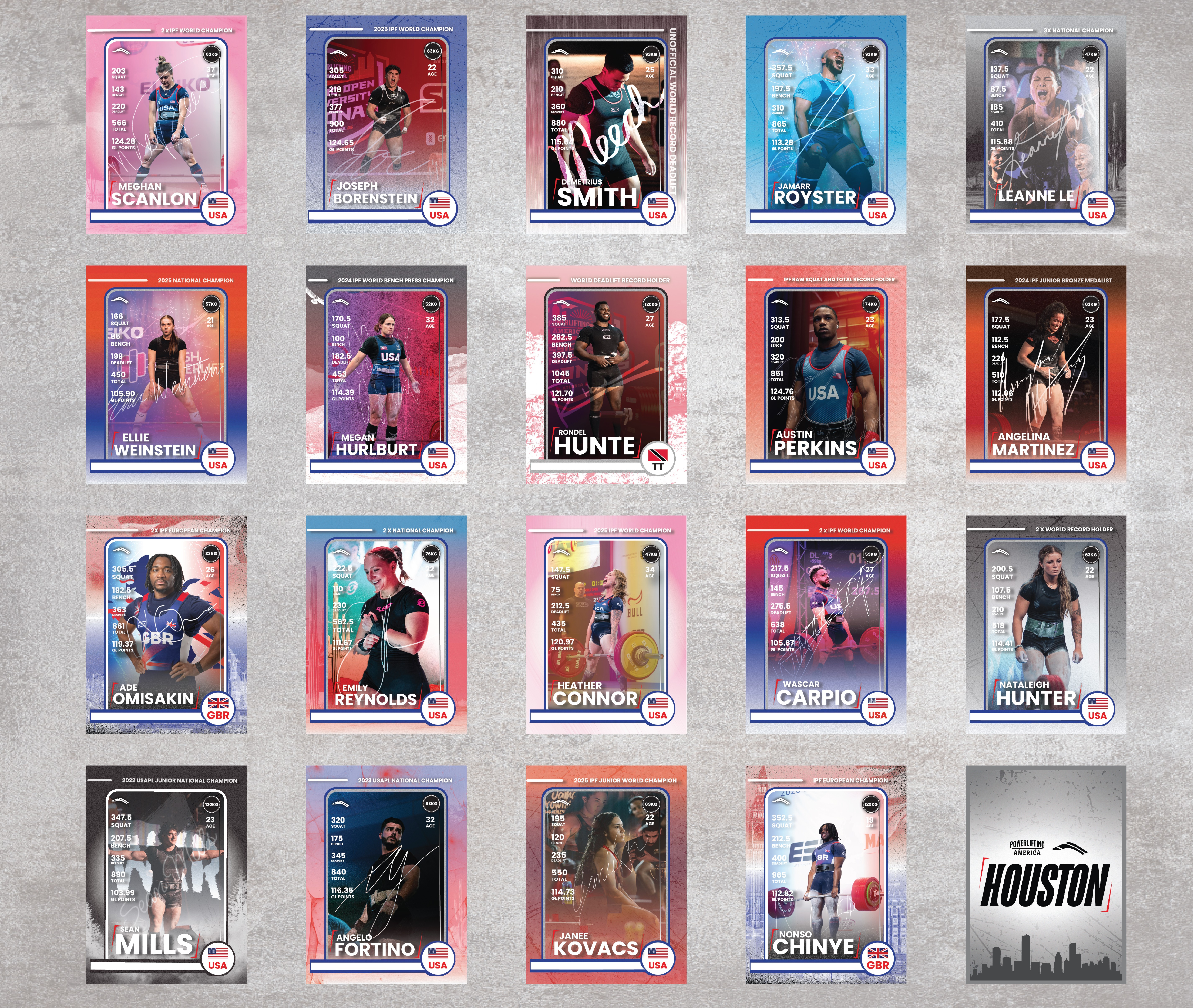 As an Avancus Graphic Designer, I designed 19 graphic trading cards for each athlete competing at the Avancus Houston powerlifting meet on October 10, 2025 based in Houston, Texas. Each card included the details of athlete name, best squat bench, and deadlift total to date, age, and key accolades.
