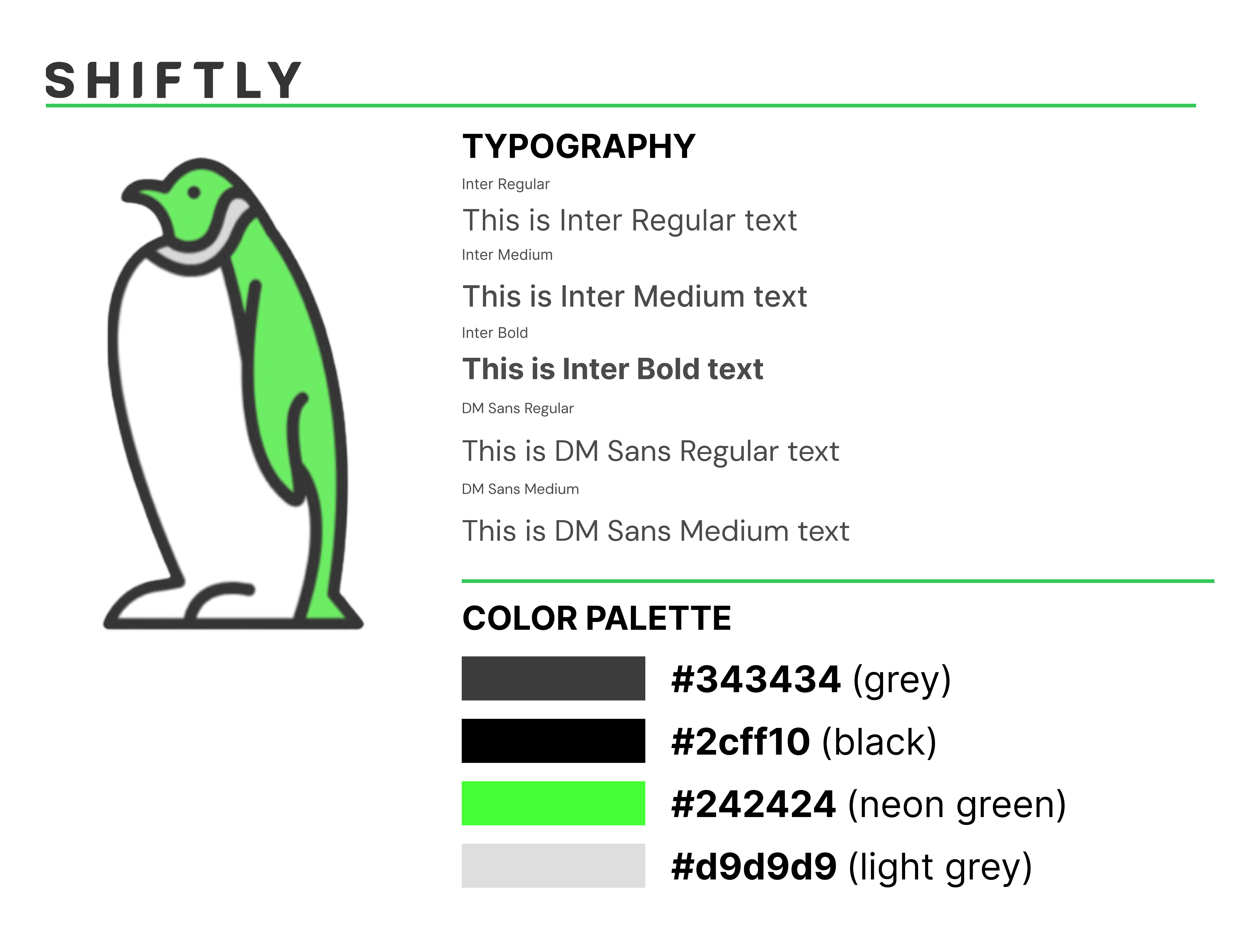 Illustration of the penguin was designed as face of the brand. Penguins work together to survive and succeed, much like students and restaurants help each other through Shiftly.